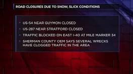 Roads close in TX, OK and NM due to inclement weather Roads close in TX, OK and NM due to inclement weather ... from Guymon to the Texas border due to continuing snowy and slick weather conditions.