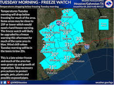 Tuesday morning to be 'one of the coldest' of winter in the Houston area, forecasters say A strong cold front hitting southeast Texas will drop temperatures to below ... Wind gusts could be as high as 20 mph today, the weather service said.