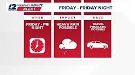 12News issues weather impact alert for Friday in Southeast Texas - YouTube All day Friday through Friday night, locally heavy rainfall is possible with one to three inches expected and up to five inches possible.